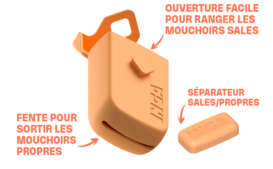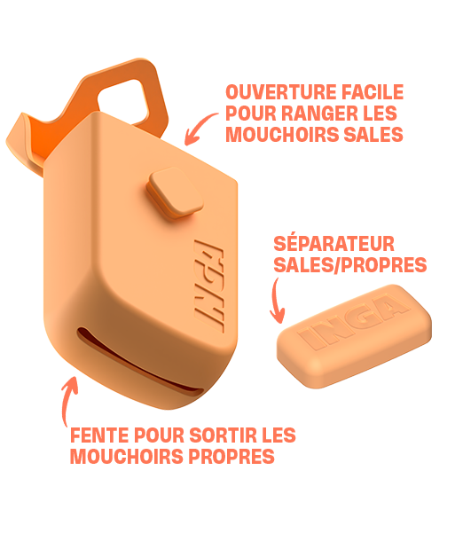 Les mouchoirs INGA viennent dans leur étui souple avec 2 compartiments séparés : un pour les mouchoirs propres, un pour les sales. Et hop, c’est dans la poche !