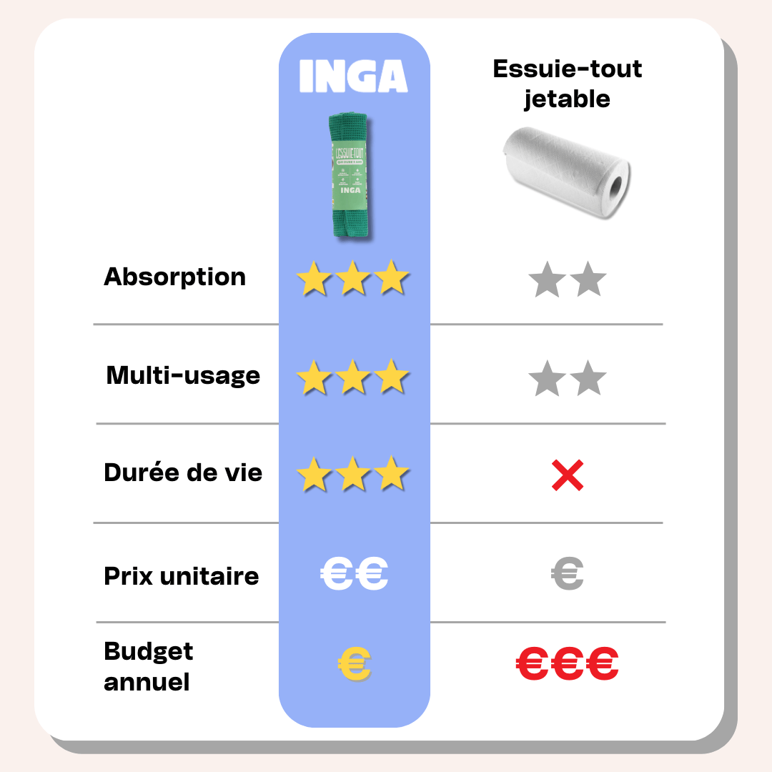 Acheter l’essuie-tout INGA, c’est aussi ne plus acheter – des centaines de fois – de produits équivalents jetables, donc au final vous faites de belles économies ! 💲